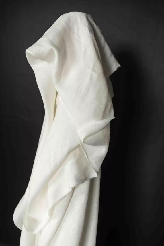 European laundered linen, tumbled at the mill for softness. Off white, more warm than Virgin white.