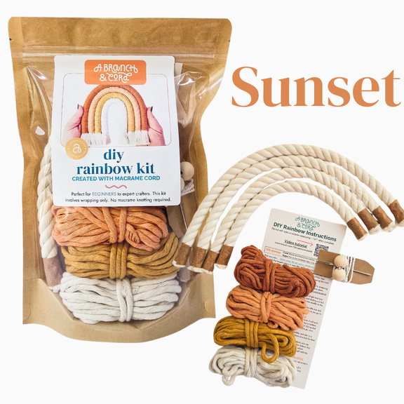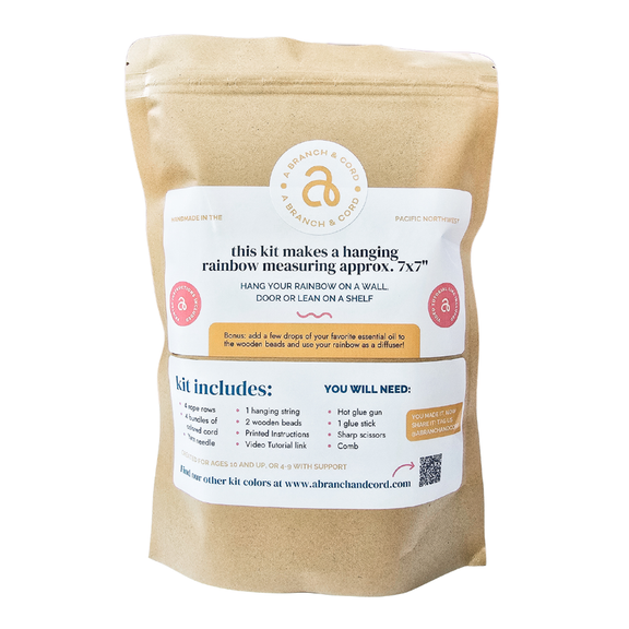 While the kit includes macrame cord, no macrame knotting is required in this kit! Simply the act of wrapping is needed to complete. The finished rainbow is ~7x7".