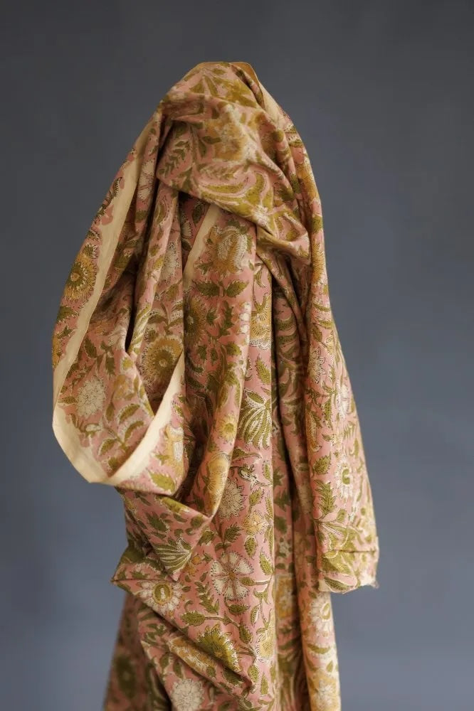 A delicate and pretty Indian blockprint in tones of pink, green and mustard.