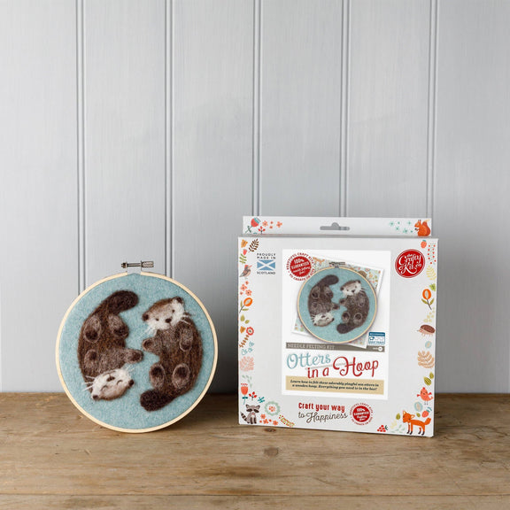 Designed and made in Scotland by The Crafty Kit Company. Your Otters in a Hoop Needle Felting Craft Kit contains: 100% Corriedale wool, wool mix felt fabric, a recycled foam mat, felting needles, bamboo embroidery hoop, needle and thread, full colour instructions.