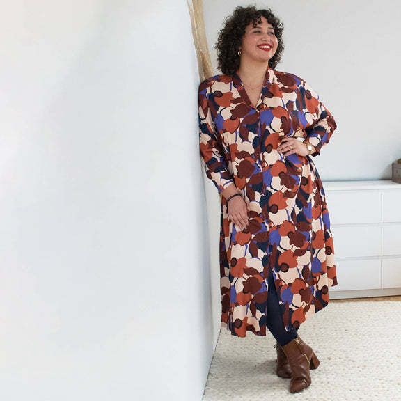 Meet Bridgette—the sewing pattern that brings vintage charm with modern ease. This playful design features dramatic bat sleeves, a flattering shawl collar, and a gracefully flared midi skirt that twirls just right. Two clever hollow pleats define the waistline for a silhouette that feels both polished and effortlessly chic. Perfect for sewers ready to tackle advanced techniques, Bridgette comes in sizes XS to XL (34/36 to 48/50).