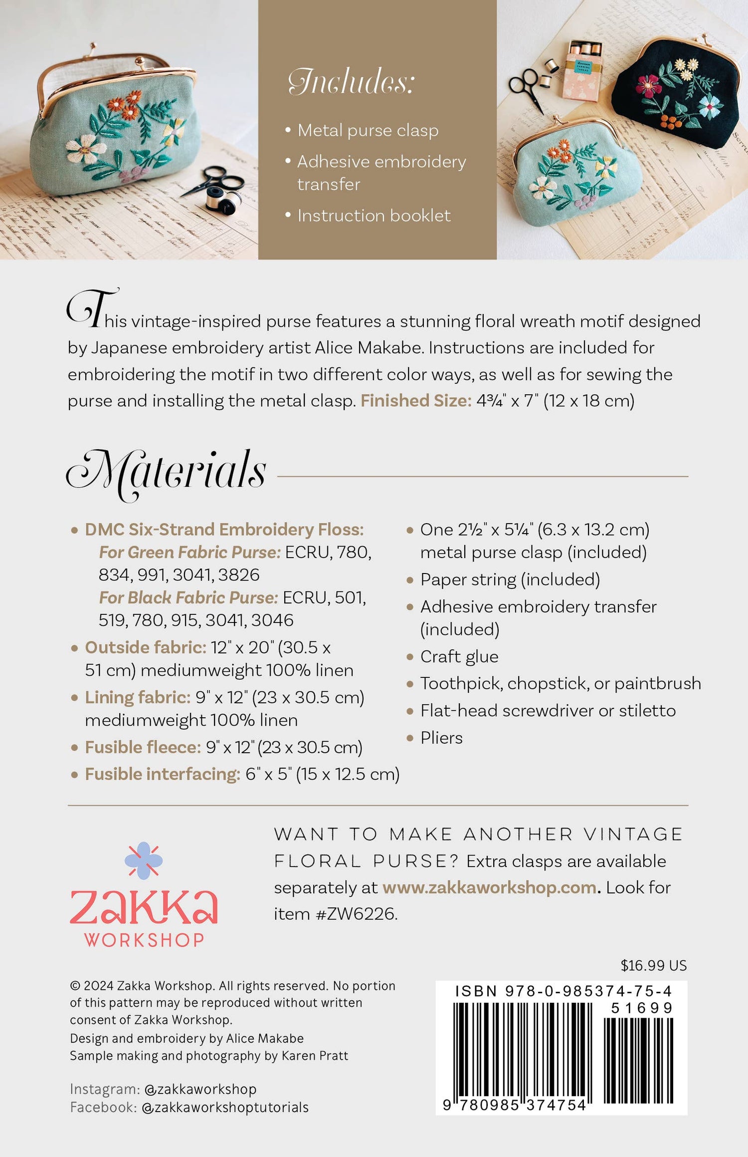 This vintage-inspired purse features a stunning floral wreath motif designed by Japanese embroidery artist Alice Makabe. Instructions are included for embroidering the motif in two different colour ways, as well as for sewing the purse and installing the metal clasp.