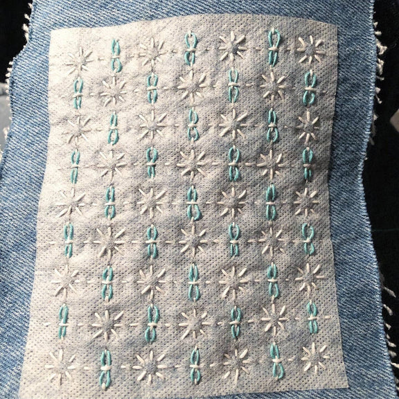 Stick, Stitch, & Rinse mending patterns. I created these water-soluble mending transfers for people like me who are looking for an easier way to transfer a beautiful pattern. No need for rulers and pencils, tracing paper, or an iron. Stick the transfer to the area to be mended, stitch the pattern, and then rinse off the sticker, and reveal your precise stitched pattern. Instructions for use are included. Each set is single-use and includes the following designs: