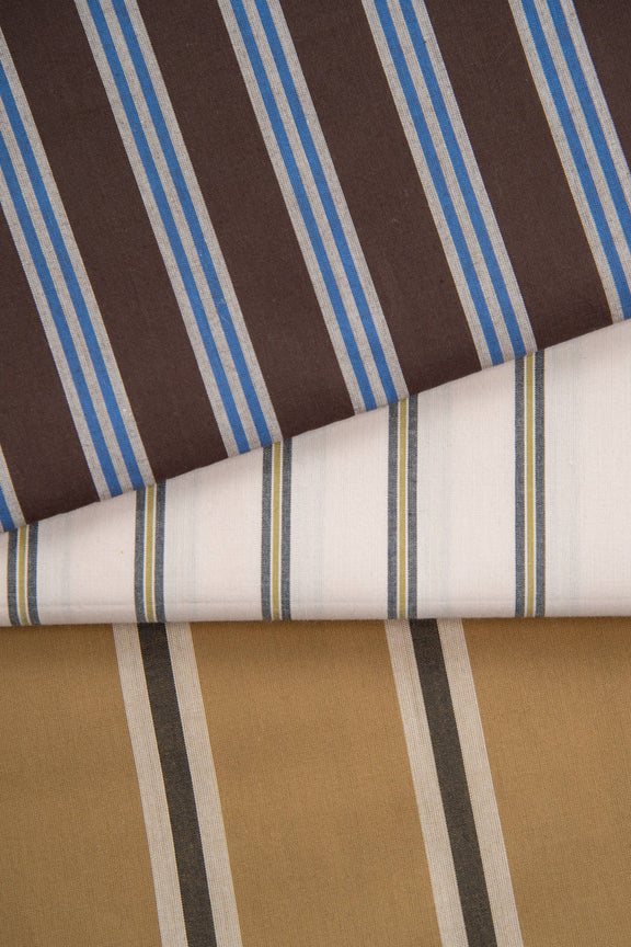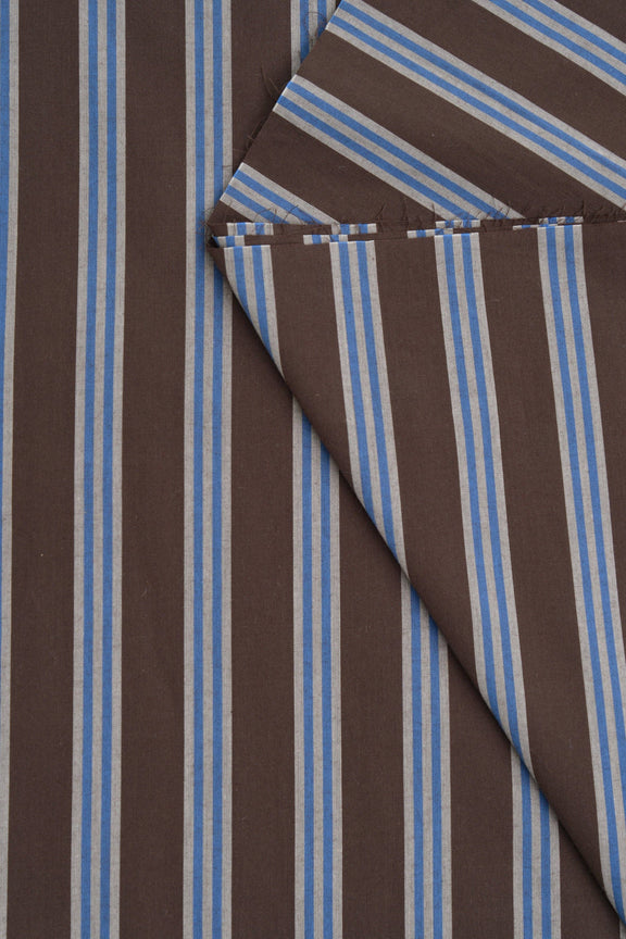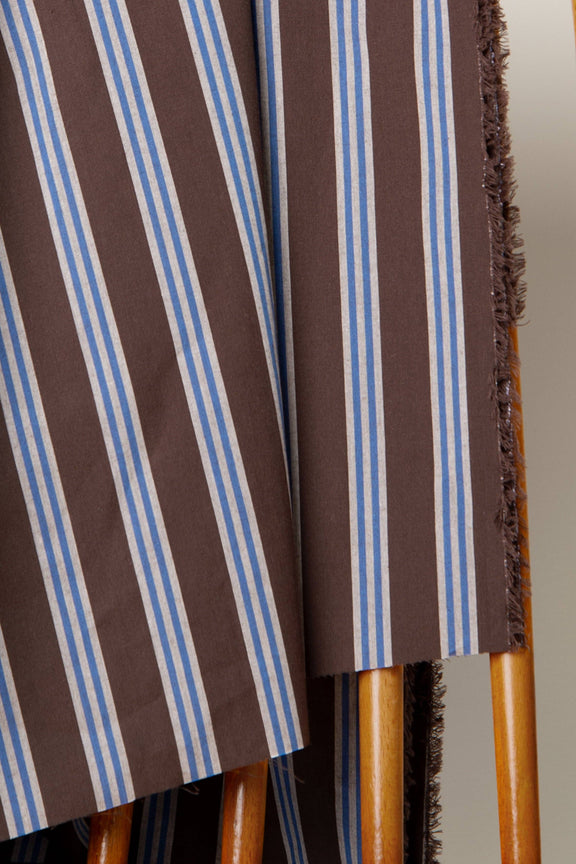 On a deep chocolate base, the fine blue stripes bring a luminous, almost graphic energy. A fabric designed to structure LA Chemiserie 's strong pieces in particular.